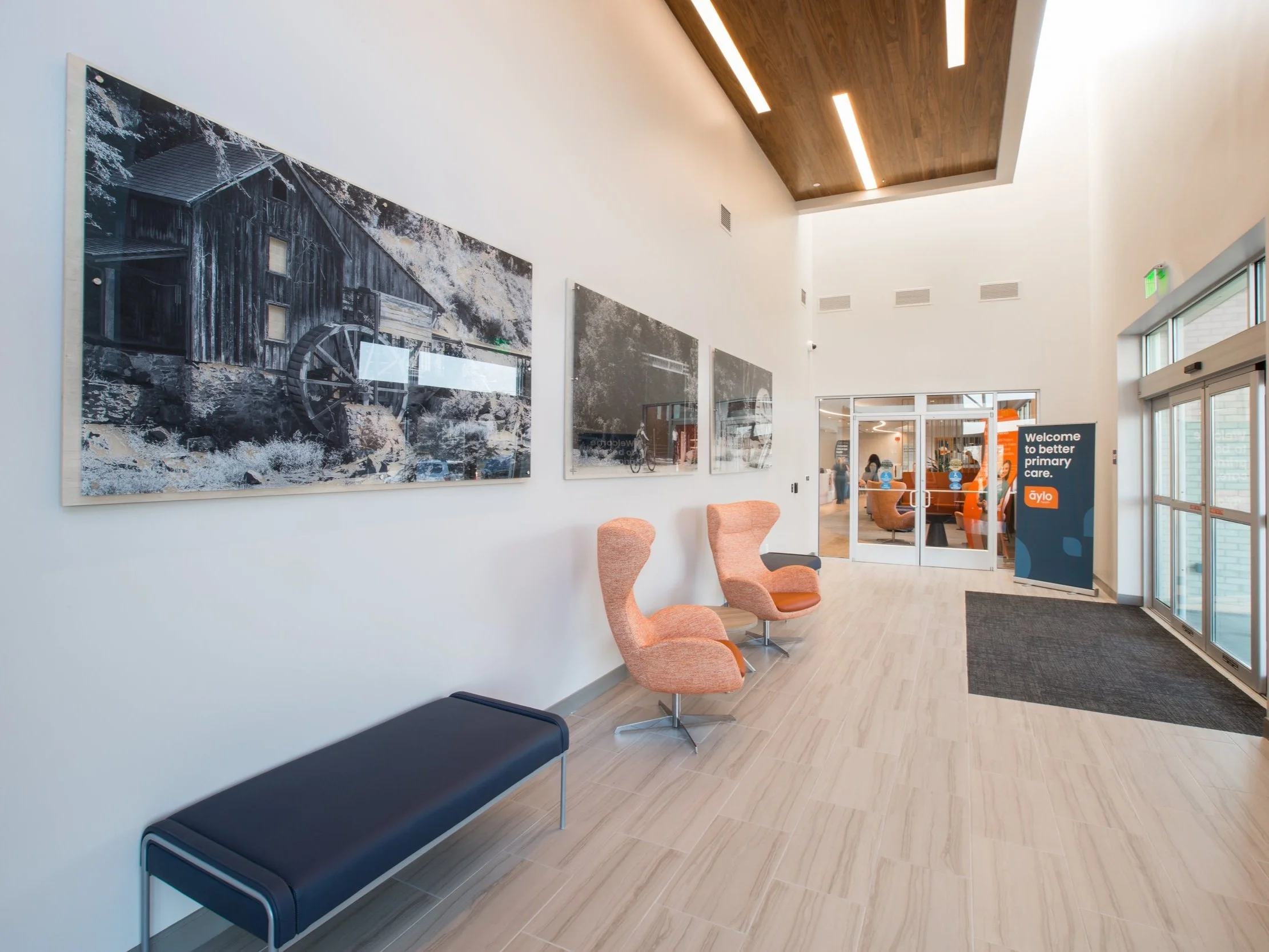 Aylo Health had a vision of a modern concept for their new construction project pushing the boundaries of traditional medical office design to create a space with a high-end, hospitality look and feel. The client's desire for a hospitality concept led to partnering with Brent, Vice President of Real Estate at Aylo Health, who played a pivotal role in guiding the project design. The goal was clear – to seamlessly blend healthcare functionality with the warmth of a hospitality design. To bring this vision to life, the team carefully selected products from various manufacturers such as Global Furniture Group, MillerKnoll (Muuto), Kimball International, and 9to5. The addition of custom artwork by BetweenPixels imprinted a distinctive touch, with the contribution of color-matched pieces to spread brand identity throughout the space.